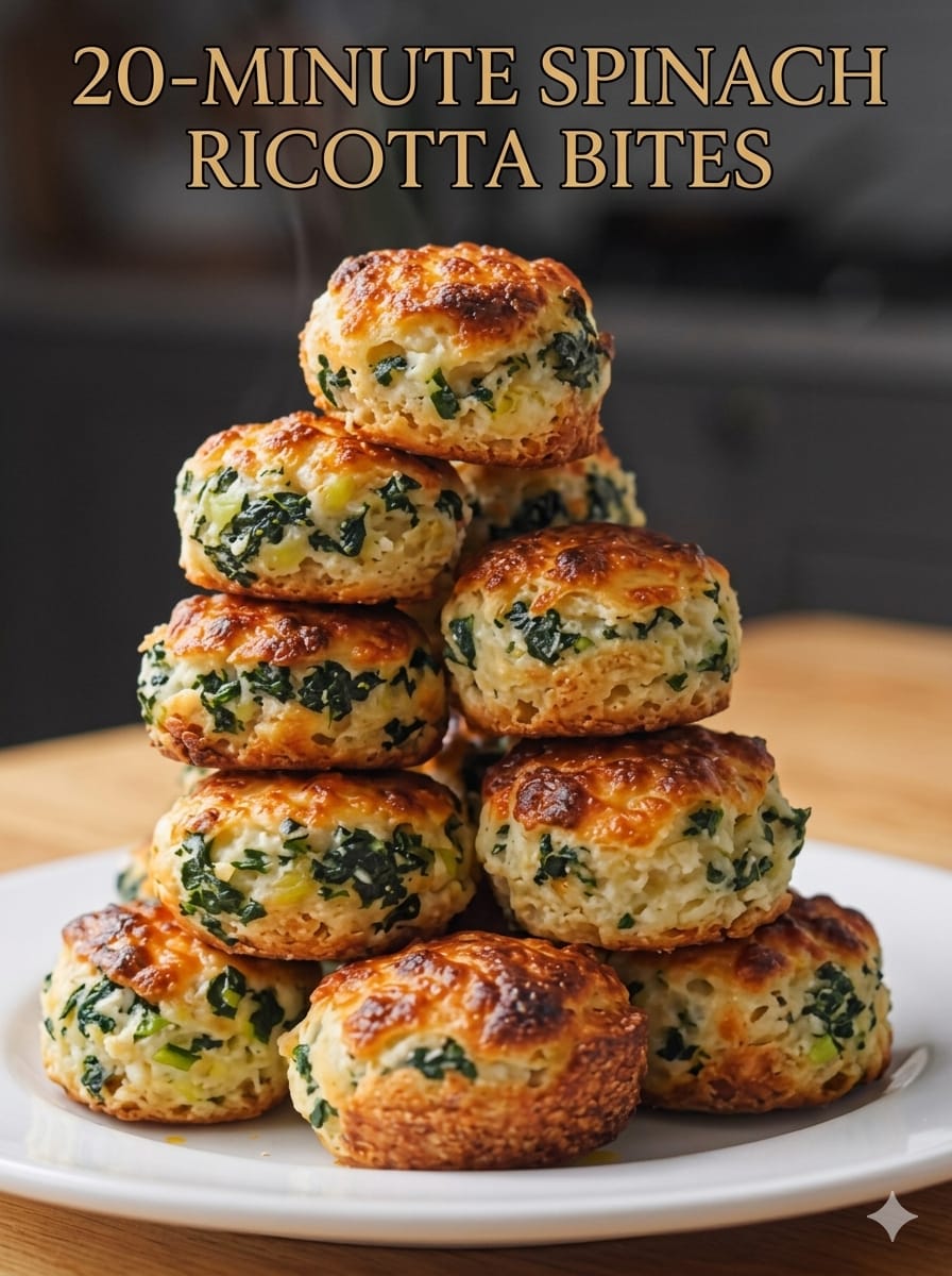 These spinach ricotta bites are quick, cheesy, and packed with flavor, making them the perfect snack, appetizer, or light meal. Soft on the inside with a lightly golden exterior, they combine creamy ricotta, savory Parmesan, and fresh spinach into bite-sized portions that are both comforting and nutritious. Ready in just 20 minutes, they’re ideal for busy days, party platters, or even lunchbox prep. Simple ingredients come together to create something warm, satisfying, and endlessly snackable.