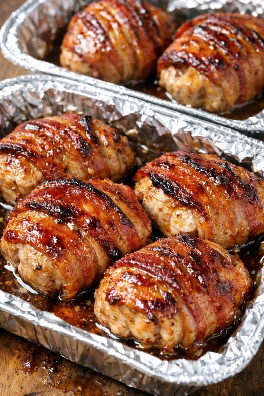 These succulent chicken thighs are seasoned with a smoky dry rub, wrapped tightly in premium bacon, and slow-roasted (or smoked) until the bacon is crisp and the chicken is tender. A final brush of honey-BBQ glaze creates that irresistible mahogany sheen.