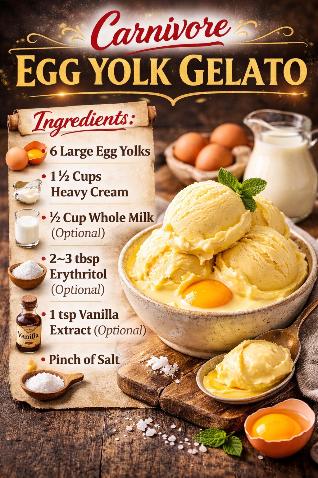 Carnivore Egg Yolk Gelato is a rich, silky, ultra-creamy frozen dessert made entirely from animal-based ingredients. Unlike traditional ice cream, this version relies heavily on egg yolks for its luxurious texture and natural thickening power. It’s smooth, custardy, high in healthy fats, and perfect for strict carnivore or animal-based diets.