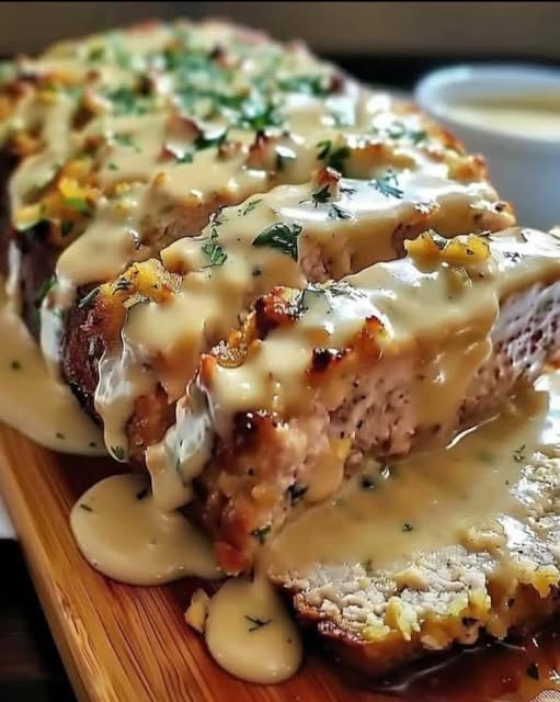 Serve: Slice the meatloaf into thick rounds and pour the warm Dijon gravy over the top.