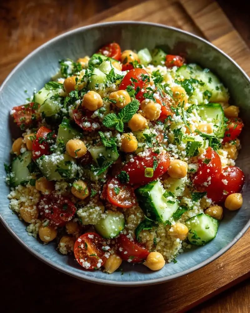 This vibrant twist on traditional tabbouleh uses chickpeas for extra protein while keeping the classic freshness of parsley, mint, cucumber, and lemon. Light yet filling, it’s perfect as a salad, side dish, or even a vegetarian main.