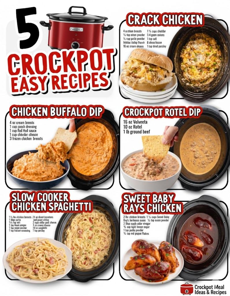 Crack Chicken is one of the “5 Crockpot Easy Recipes” featured. It’s served as a sandwich filling and also shown directly inside the slow cooker. The ingredients listed in the image align with the classic ranch–cheddar–cream cheese version.