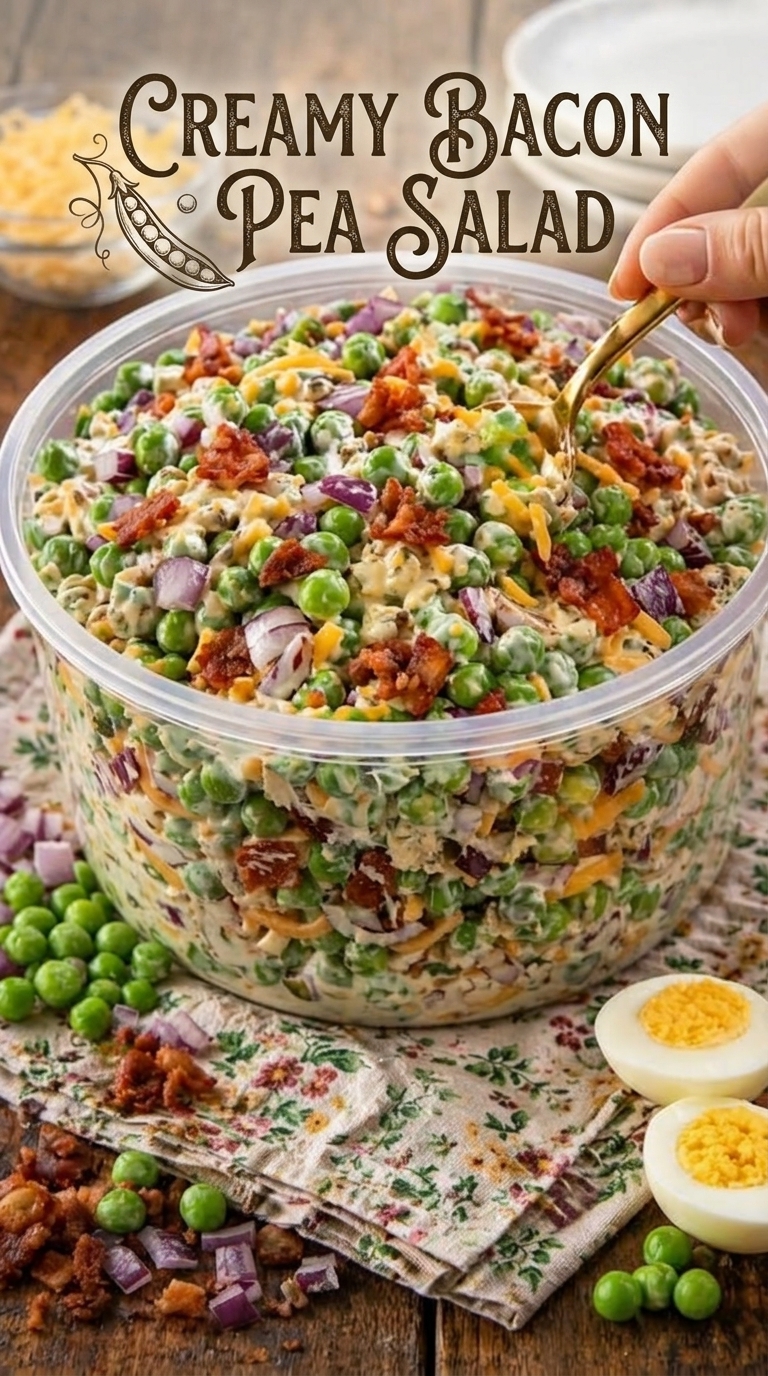Creamy Bacon Pea Salad is a classic cold side dish made with sweet green peas, crispy bacon, sharp cheese, and a tangy, creamy dressing. It’s popular at picnics, potlucks, and BBQs because it’s easy to prepare, flavorful, and can be made ahead of time.