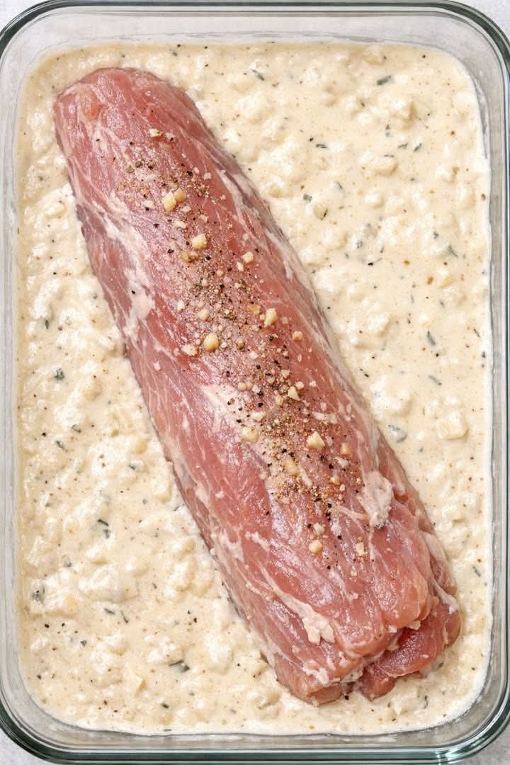 4. Assemble: Place the pork tenderloin in a glass baking dish (as seen in your photo). Pour the cream mixture over and around the meat until it’s halfway submerged.