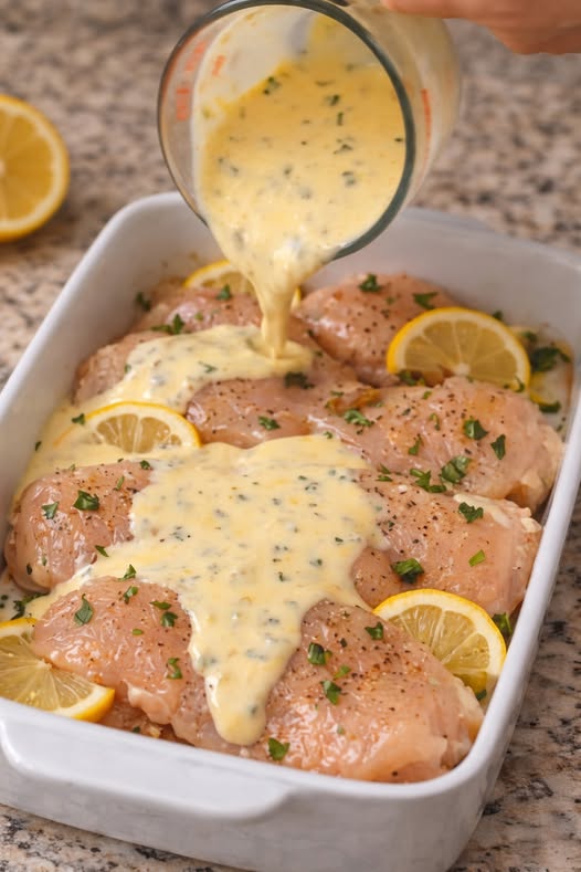 Assemble: Pour the cream mixture over the chicken. Tuck the lemon slices between the pieces of chicken.