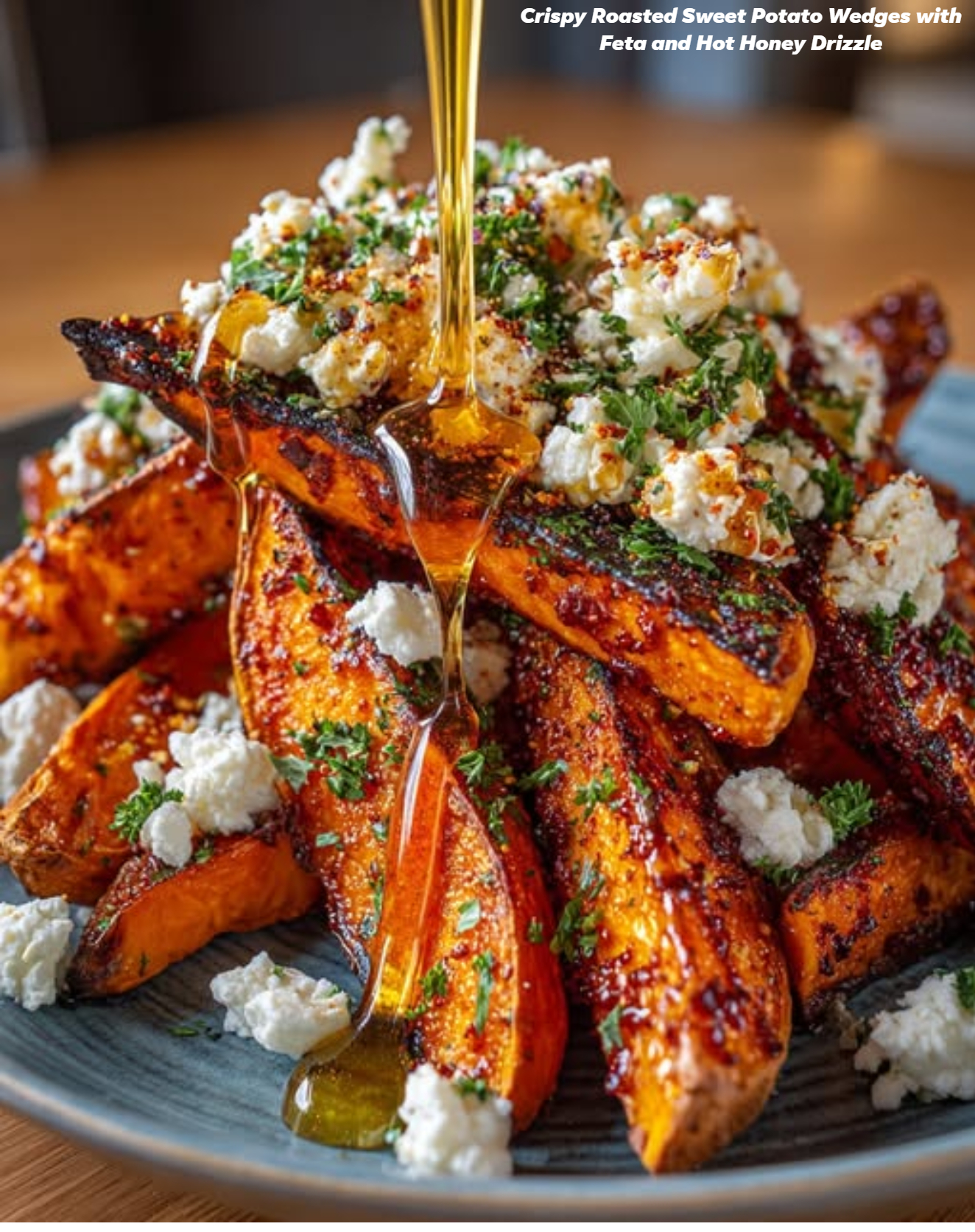 Crispy Roasted Sweet Potato Wedges with Feta & Hot Honey Drizzle