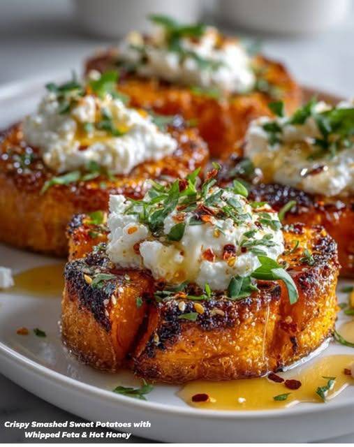 Crispy Smashed Sweet Potatoes with Whipped Feta & Hot Honey is a flavor-packed dish that perfectly balances crispy textures with creamy, sweet, and spicy elements. Tender sweet potatoes are boiled until soft, then gently smashed and roasted until golden and crisp. They are served over a smooth, tangy whipped feta that complements the natural sweetness of the potatoes. A drizzle of warm hot honey with chili flakes adds a bold sweet-heat finish. This dish is perfect as an appetizer, side, or even a brunch option and brings a beautiful Mediterranean-inspired touch to your table.