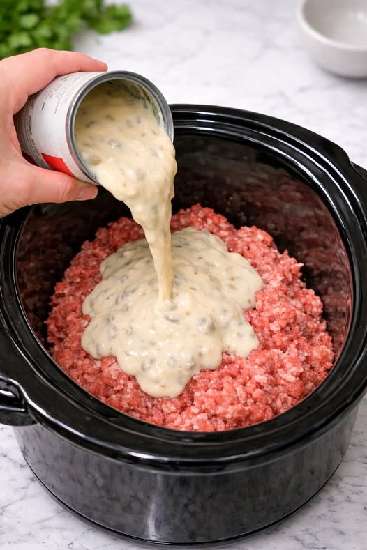Q: Can I put the meat in raw like the picture shows? A: Yes! While searing adds flavor, the slow cooker will safely cook the ground beef through. Just ensure the internal temperature reaches 160°F (71°C).