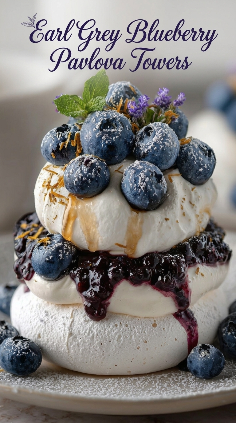 Earl Grey Blueberry Pavlova Towers are an elegant twist on the classic pavlova. Crisp on the outside and marshmallow-soft inside, these meringue layers are infused with subtle Earl Grey tea flavor, stacked with whipped cream and blueberry compote. The result is a light, aromatic dessert with floral citrus notes from bergamot and a sweet-tart berry contrast.