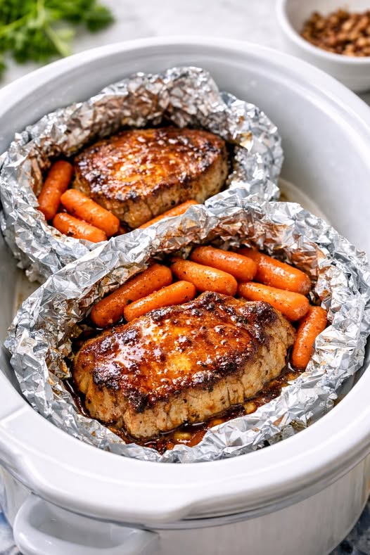 3. Assemble: Place one pork chop in the center of each foil piece. Divide the baby carrots evenly and place them around the pork.