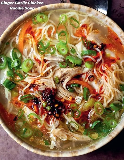 Ginger Garlic Chicken Noodle Soup is a warming, restorative bowl packed with tender chicken, silky noodles, and a fragrant broth infused with fresh ginger and garlic. Light yet deeply flavorful, this soup is perfect for cool evenings, sick days, or anytime you want something soothing and satisfying. The scallions add freshness while the ginger-garlic base gives it classic comfort-food energy.