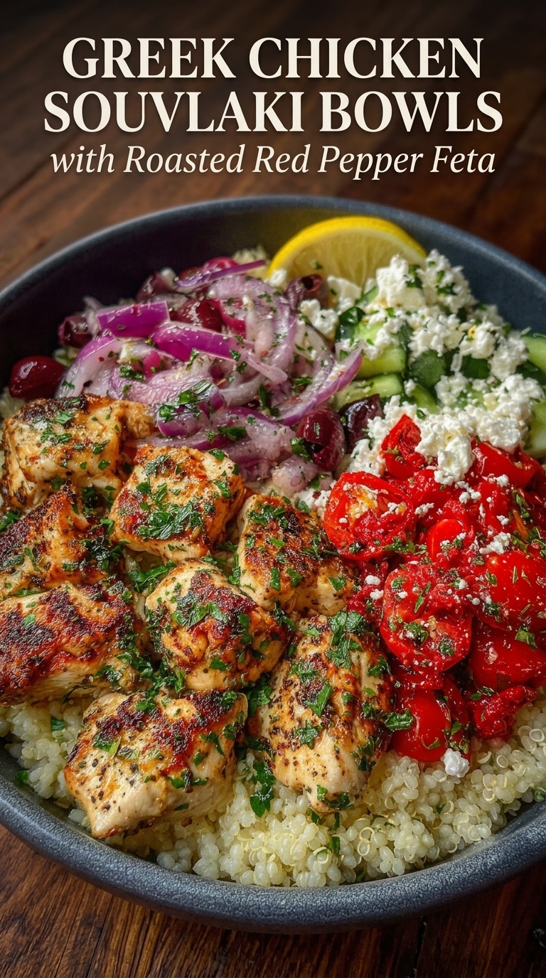🥗 Greek Chicken Souvlaki Bowls with Roasted Red Pepper Feta
