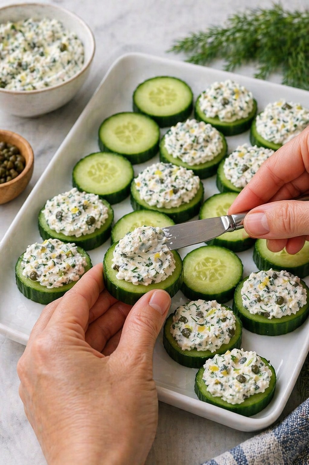 Wash and slice cucumbers into even rounds. Pat dry with a paper towel to remove excess moisture. - Make the Herbed Spread