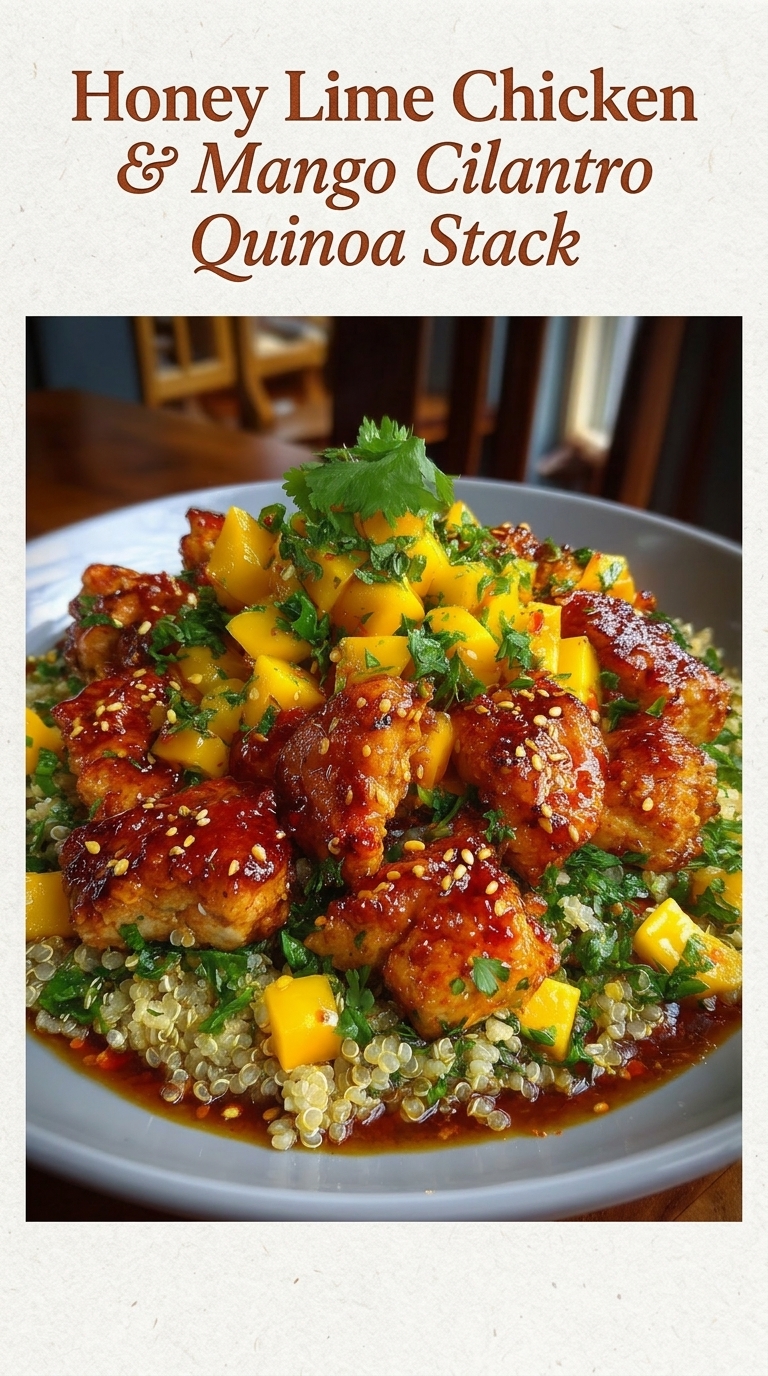 This dish combines juicy honey-lime glazed chicken with fluffy cilantro-infused quinoa and a refreshing mango salsa. It’s layered (“stacked”) for a beautiful presentation, making it perfect for both weeknight dinners and special occasions. The flavors are bright, tropical, and slightly zesty, while the textures range from tender chicken to light, fluffy quinoa and juicy mango.