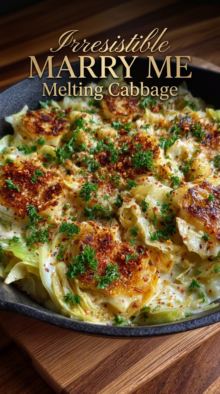 This dish takes simple cabbage and slowly roasts or braises it until it becomes buttery-soft (“melting”) with caramelized edges and a rich, savory sauce. Inspired by the “Marry Me” flavor profile (creamy, garlicky, slightly tangy, and packed with umami), it’s the kind of dish that feels indulgent despite using inexpensive ingredients.