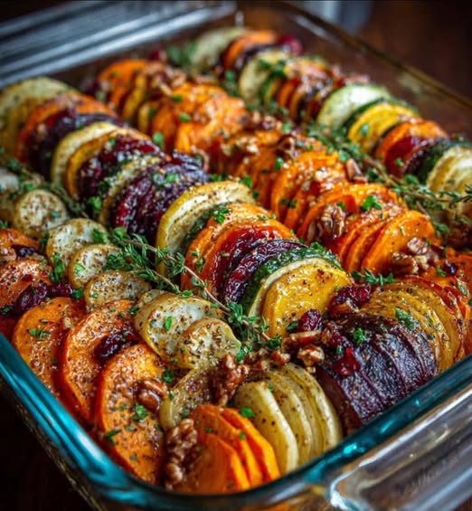 This vibrant layered vegetable bake combines thinly sliced sweet potatoes, butternut squash, and carrots, baked until tender and caramelized. The natural sweetness of the roasted vegetables is balanced by savory herbs and finished with a bright cranberry-honey drizzle that adds a tangy, glossy finish.
