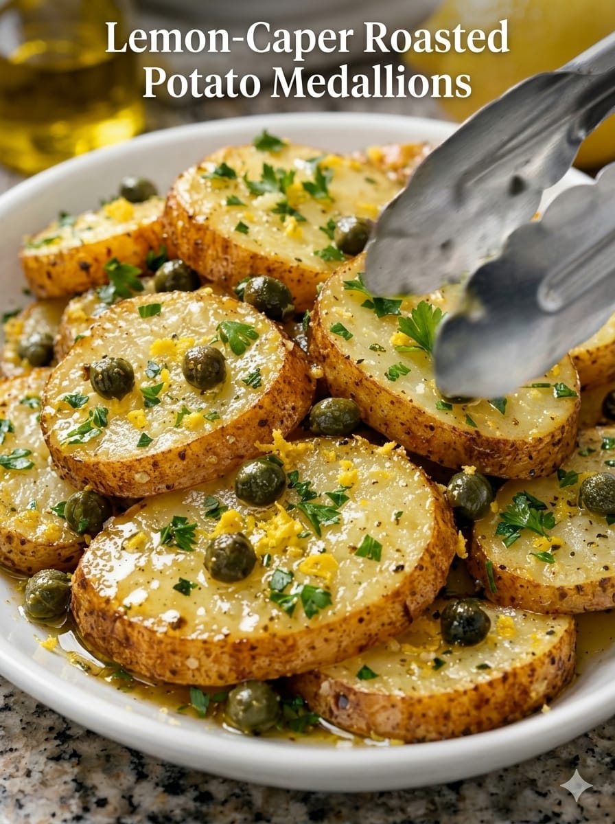 Lemon-Caper Roasted Potato Medallions are a bright and flavorful twist on classic roasted potatoes. Crisp on the outside and tender on the inside, these golden potato rounds are elevated with a zesty lemon dressing, briny capers, and fresh parsley. The combination creates a perfect balance of richness, acidity, and freshness, making this dish an ideal side for grilled meats, seafood, or vegetarian meals. Simple ingredients come together to create something vibrant, comforting, and full of Mediterranean-inspired flavor.