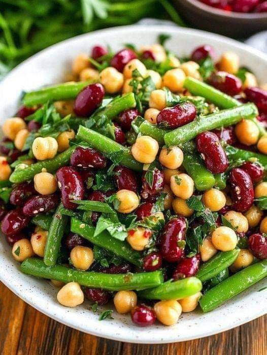 - In a large bowl, combine green beans, chickpeas, kidney beans, red onion, and parsley.