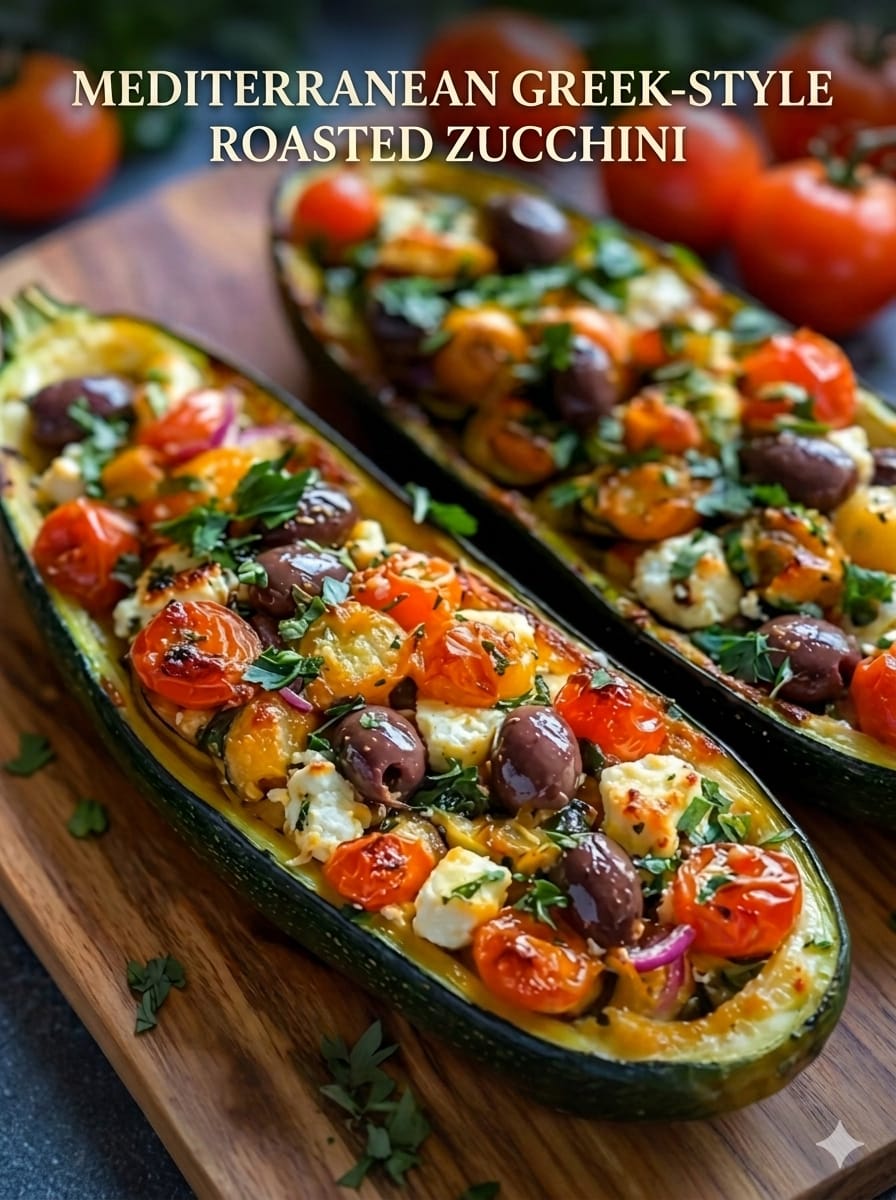 Mediterranean Greek-Style Roasted Zucchini Boats are a light, flavorful dish that brings together fresh vegetables, briny olives, creamy feta, and fragrant herbs. Hollowed zucchini halves are roasted until tender, then filled with a vibrant Mediterranean mix of cherry tomatoes, garlic, red onion, and olives. Finished with lemon, herbs, and olive oil, this dish is both healthy and satisfying. It works beautifully as a vegetarian main or a colorful side dish for grilled meats or grains.