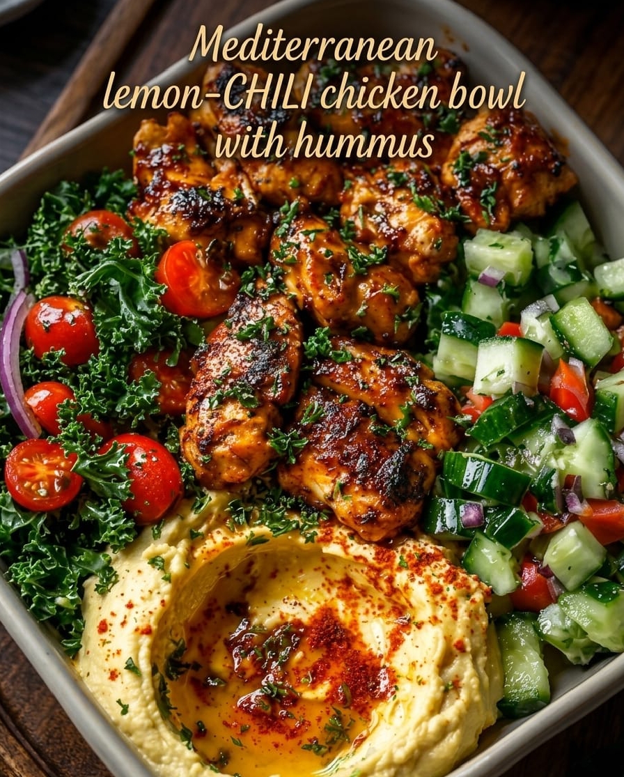 This Mediterranean lemon-chili chicken bowl is fresh, vibrant, and packed with bold flavors that feel both nourishing and satisfying. Juicy marinated chicken is paired with a crisp cucumber-tomato salad, creamy hummus, and a base of grains or greens for a complete, balanced meal. The bright citrus, gentle heat from chili flakes, and aromatic herbs create a dish that feels light yet filling. It’s perfect for meal prep, quick lunches, or a wholesome dinner that doesn’t compromise on taste.