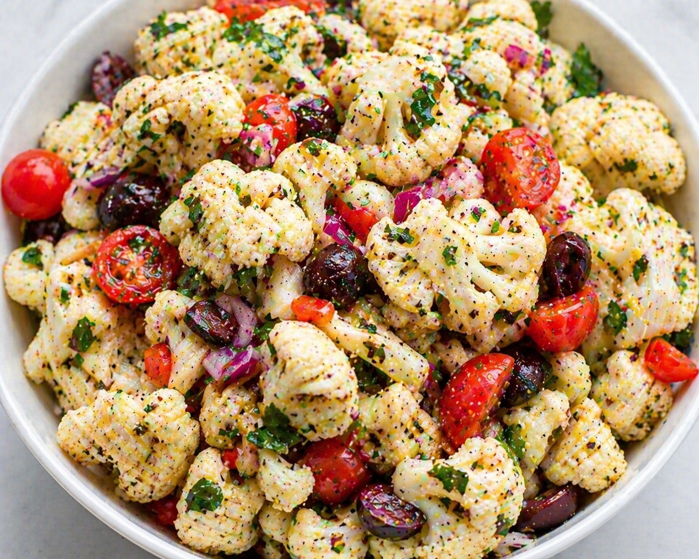 Mediterranean Marinated Cauliflower Salad is a fresh, tangy, and herb-packed dish made from lightly blanched or raw cauliflower florets tossed in a zesty olive oil–lemon dressing with classic Mediterranean ingredients like olives, tomatoes, cucumbers, herbs, and feta cheese. It’s crisp, refreshing, and develops even more flavor as it marinates.