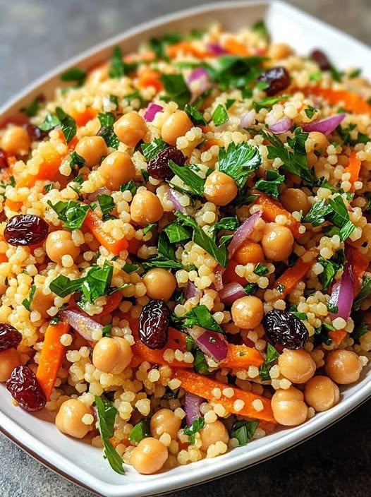 This vibrant Couscous Salad is a light yet satisfying dish made with fluffy couscous, protein-rich chickpeas, crunchy vegetables, sweet dried fruits, and fresh herbs. Inspired by flavors commonly found in Morocco and the broader Mediterranean Basin, this salad is perfect as a side dish, light lunch, or meal-prep option.