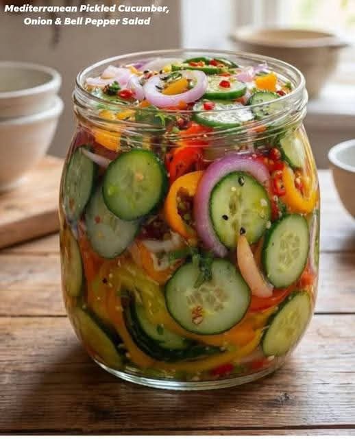 This Mediterranean-inspired salad is a vibrant and tangy mix of cucumbers, red onions, and bell peppers lightly pickled in a zesty vinegar-herb brine. Perfect as a refreshing side dish, appetizer, or topping for grilled meats, fish, or grain bowls. Its crisp texture and bold flavors make it an easy, colorful addition to any meal. Quick to prepare yet deeply flavorful, it embodies the bright, fresh flavors of the Mediterranean.
