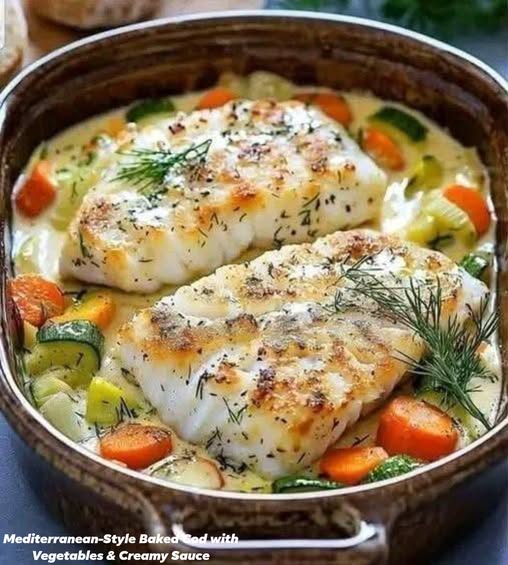 Mediterranean-Style Baked Cod with Vegetables & Creamy Sauce
