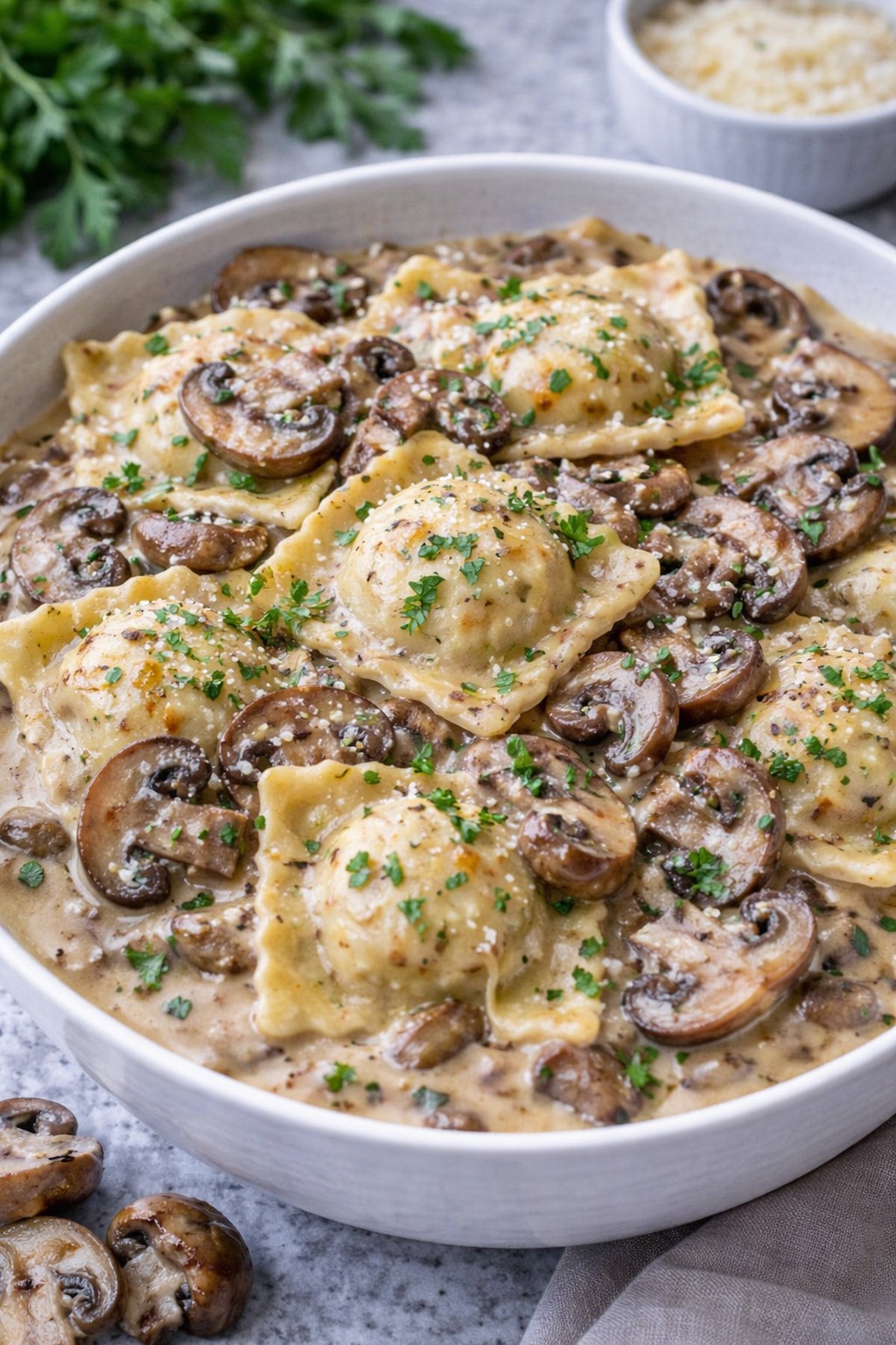 This dish is pure comfort in a bowl—pillowy mushroom ravioli coated in a velvety, garlic-infused creamy mushroom sauce. It’s earthy, cheesy, and perfect for a cozy dinner that feels restaurant-quality but is easy to make at home.