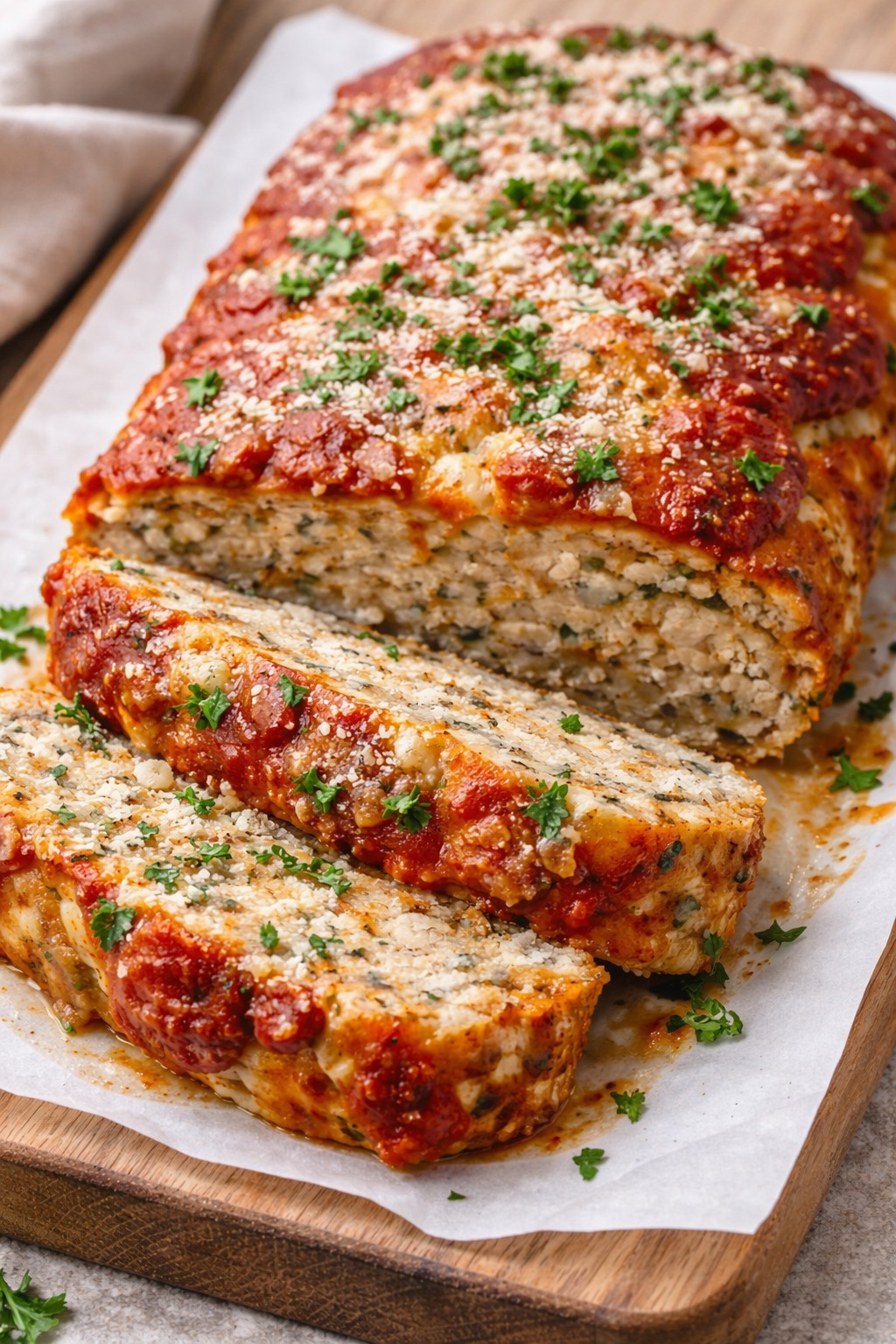 Parmesan Chicken Meatloaf is a lighter, flavorful twist on classic meatloaf. Made with juicy ground chicken, Italian herbs, and plenty of Parmesan cheese, then topped with marinara and melted cheese—this dish is tender, cheesy, and packed with comforting Italian-inspired flavor.