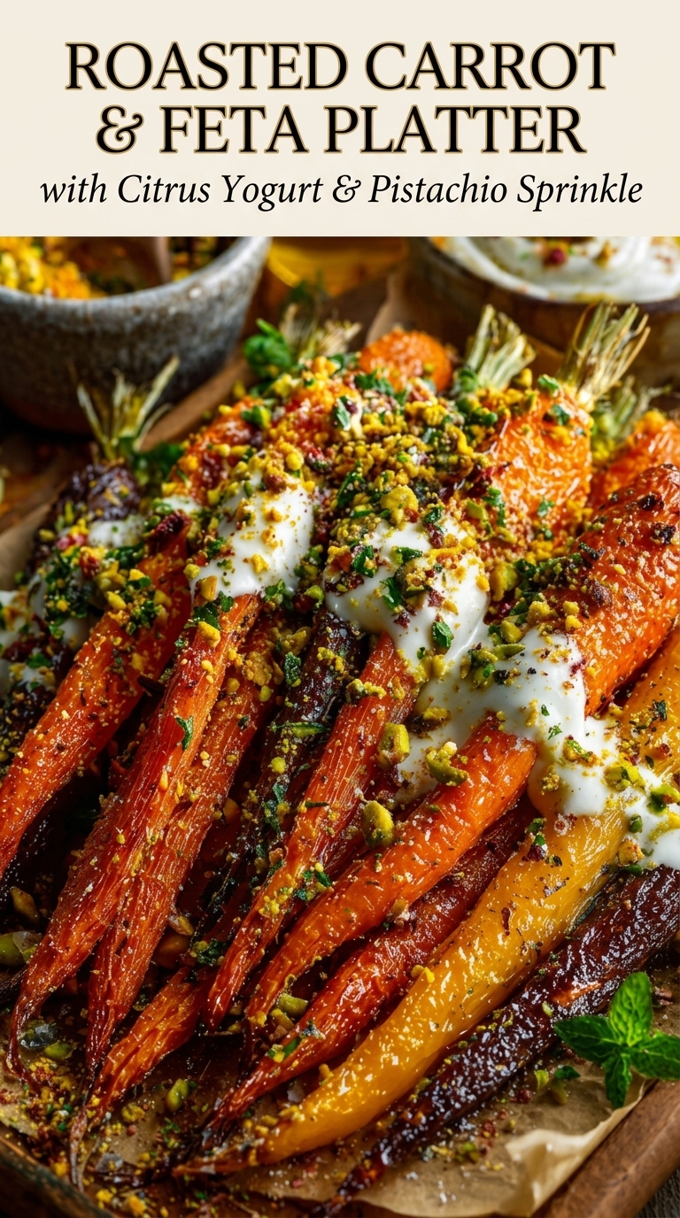 This dish is a vibrant, sweet-and-savory roasted vegetable platter featuring caramelized carrots paired with creamy citrus-infused yogurt, salty feta, and crunchy pistachios. It works beautifully as a side dish, mezze platter centerpiece, or light vegetarian meal. The contrast of textures—soft roasted carrots, silky yogurt, crumbly cheese, and crunchy nuts—makes it both visually stunning and deeply satisfying.