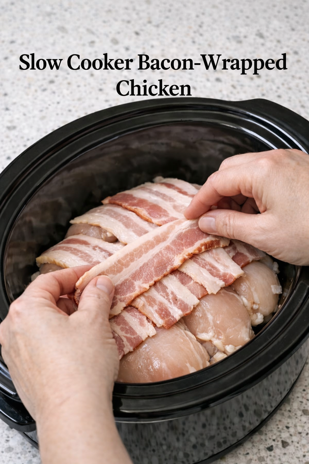 After slow cooking, place the chicken under the broiler for 3–5 minutes to crisp the bacon.