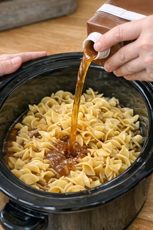 Q: Can I cook the noodles separately? A: Yes! If you prefer a thinner sauce, boil the noodles on the stove and pour the beef/gravy over them. Cooking them in the pot (as pictured) makes the dish starchier and more “casserole-like.”