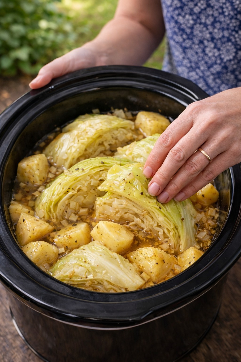 - Layer Ingredients: Place potatoes at the bottom of the slow cooker, followed by cabbage wedges.