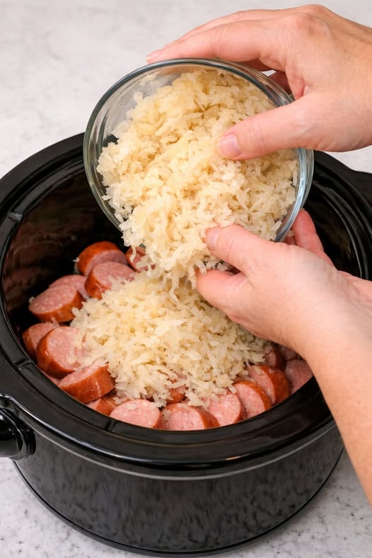 3. Combine: Fold in the thawed hash browns, diced onions, and the cooked sausage. Stir until everything is evenly coated in the creamy sauce.