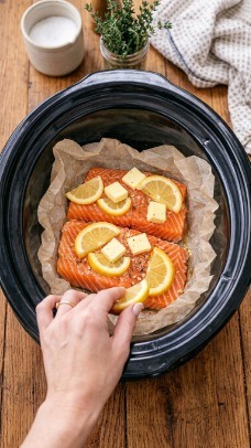 Two vibrant salmon fillets are seasoned with garlic and herbs, topped with pats of butter and fresh lemon slices, and nestled into a parchment-lined slow cooker. The parchment paper acts as a “sling,” making it easy to lift the delicate fish out once it’s finished, while also keeping the cleanup effortless.