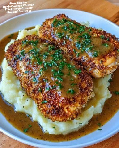 Slow Cooker Herb-Crusted Chicken Fillets with Creamy Mashed Potatoes is a comforting, wholesome meal that combines tender, juicy chicken infused with aromatic herbs and perfectly smooth mashed potatoes. Cooking the chicken slowly allows the flavors to deepen while keeping the meat moist, making this dish ideal for busy weeknights or relaxed family dinners. The creamy mashed potatoes balance the savory herbs beautifully, creating a satisfying and hearty plate.