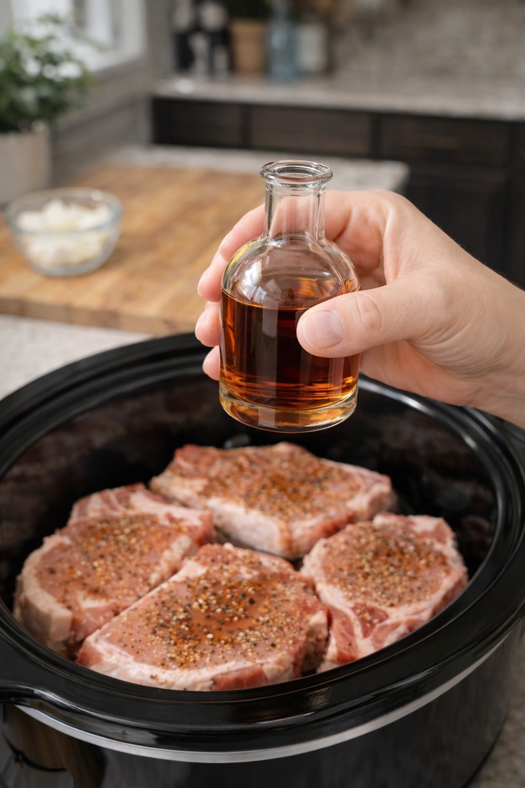 Searing (Optional): If you prefer a deeper flavor, sear the chops in a hot skillet with a tablespoon of oil for 2 minutes per side before adding them to the crockpot.