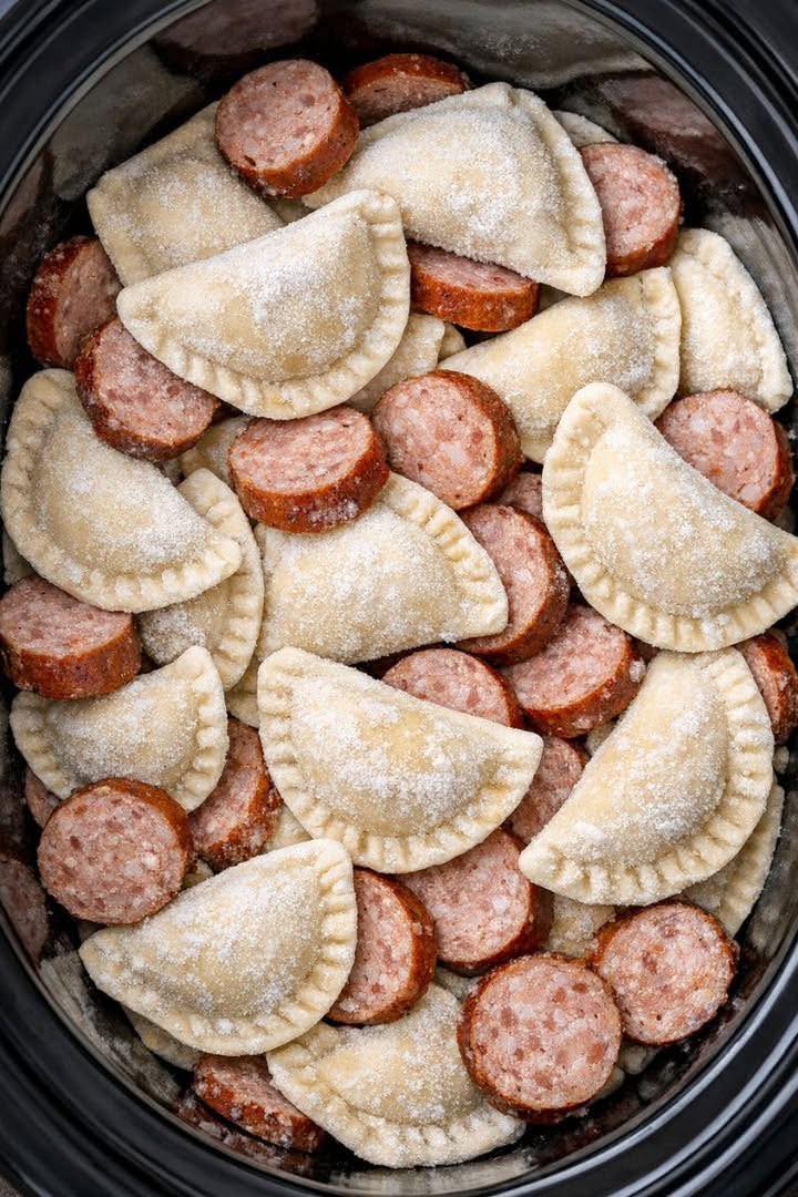 Layer: Place the sliced kielbasa and frozen pierogies into the slow cooker.