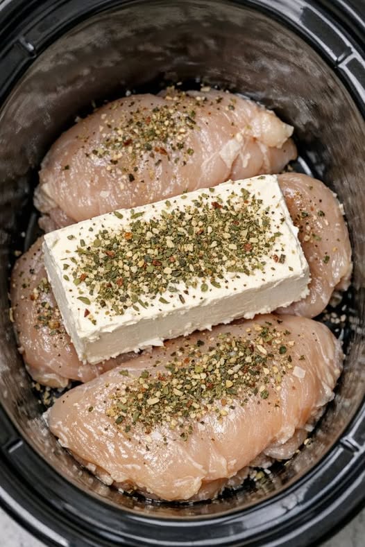 2. Add Cheese: Top the chicken with the cubed cream cheese and the Parmesan cheese. Don’t worry about stirring it yet.