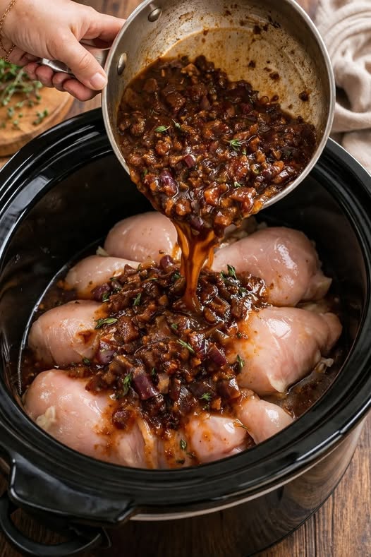 This Slow Cooker Savory Onion Garlic Chicken is a rich, comforting, and flavor-packed dish that transforms simple ingredients into something truly delicious. Juicy chicken breasts are slow-cooked in a deeply savory sauce made with caramelized onions, garlic, herbs, and a slightly sweet and tangy glaze. As the sauce cooks down, it infuses the chicken with bold flavor while keeping it tender and moist. The result is a melt-in-your-mouth texture paired with a thick, aromatic sauce that’s perfect for spooning over rice, mashed potatoes, or even pasta. This recipe is ideal for busy weeknights or meal prep, offering maximum flavor with minimal effort.