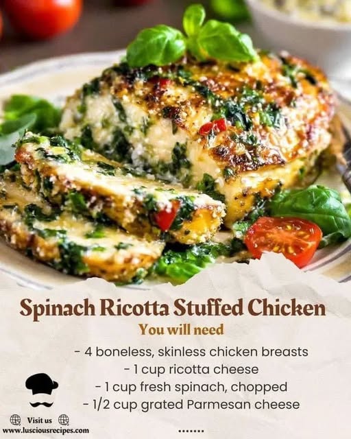 Spinach Ricotta Stuffed Chicken is a flavorful, protein-rich dish featuring juicy chicken breasts filled with a creamy blend of ricotta cheese, sautéed spinach, garlic, and herbs. The chicken is lightly seasoned, baked until tender, and finished with a golden exterior. This recipe feels elegant enough for entertaining yet simple enough for a healthy weeknight dinner.