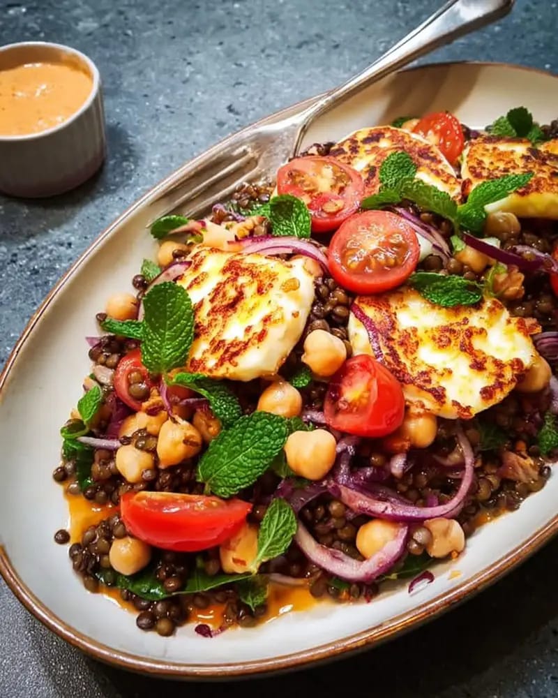 This hearty warm salad combines protein-rich lentils and chickpeas with crispy golden halloumi, all tossed in a lemon-herb vinaigrette with roasted vegetables and fresh greens. It’s comforting, satisfying, and packed with texture — ideal as a wholesome lunch or light dinner.